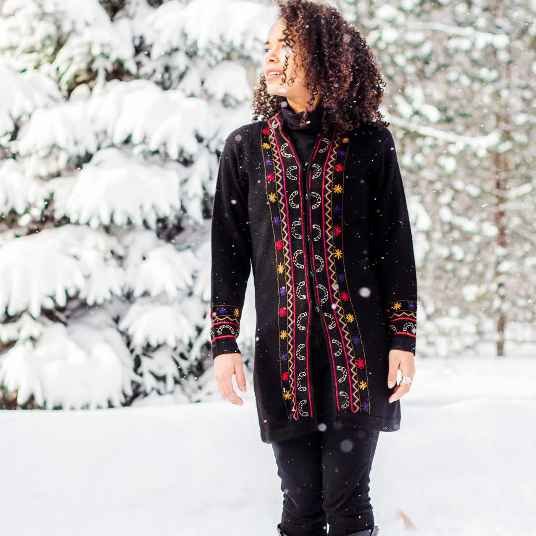 The beautiful details of hand embroidery is done by women artisans in Northern India on a soft, printed poly-silk blend. The classic sari print is enhanced by the traditional Indian embroidery motifs on the front and back.