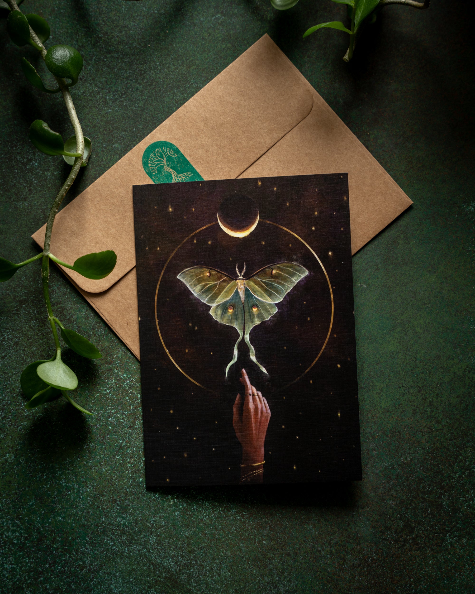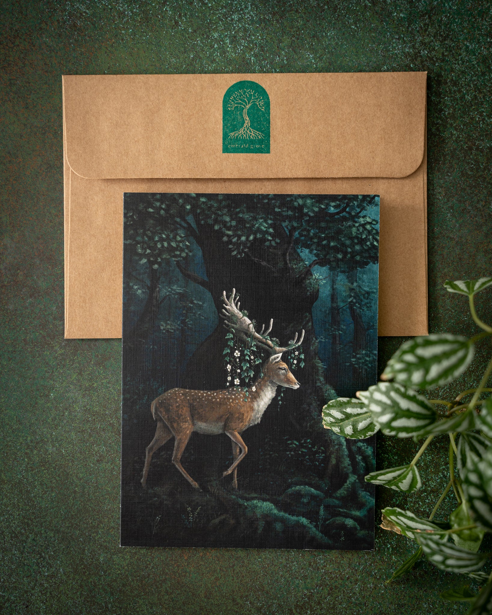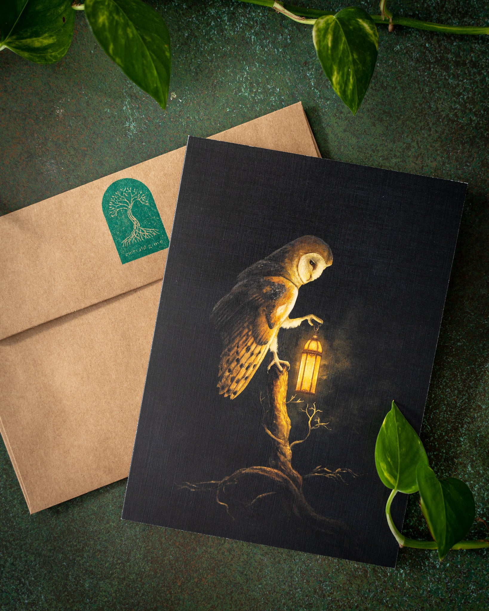 Imprimé sur du papier cartonné en lin de haute qualité. Chaque enveloppe est estampillée du logo Emerald Grove.
