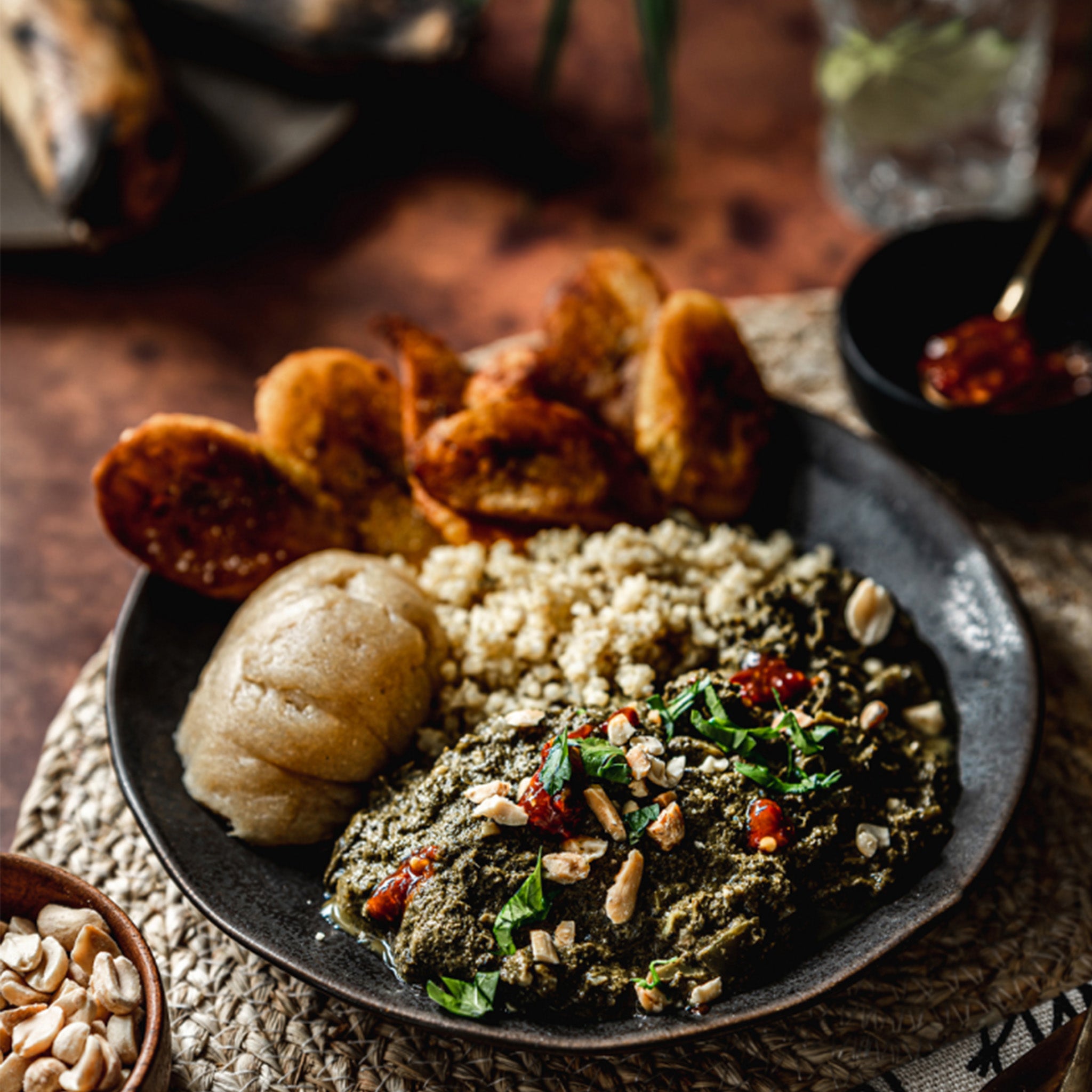 • Petites assiettes et salades : Plantains poêlés ; Salade d'orge perlée avec poivrons rôtis et feta végétalienne ; Bok Choy glacé à l'ail et au miso; Fufu