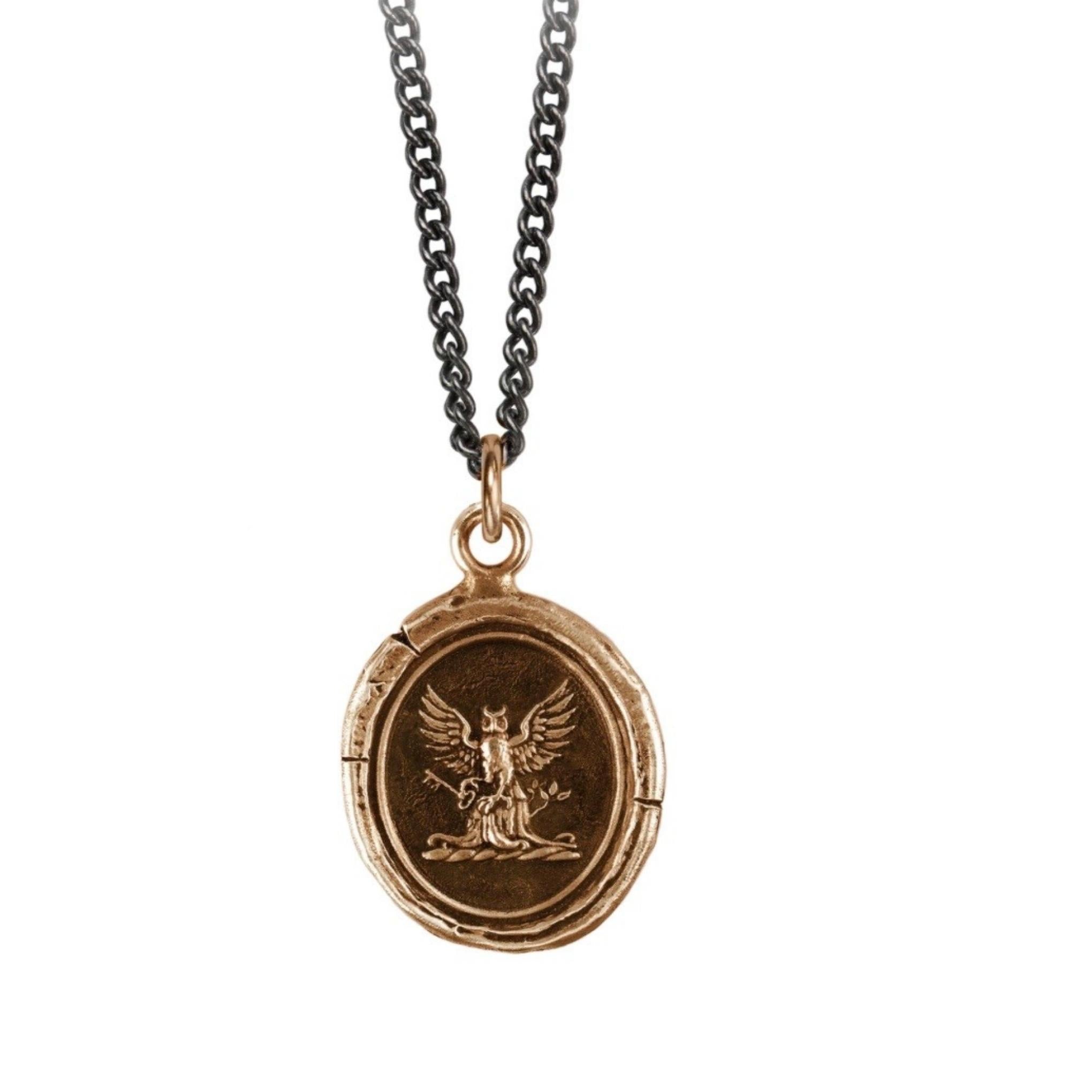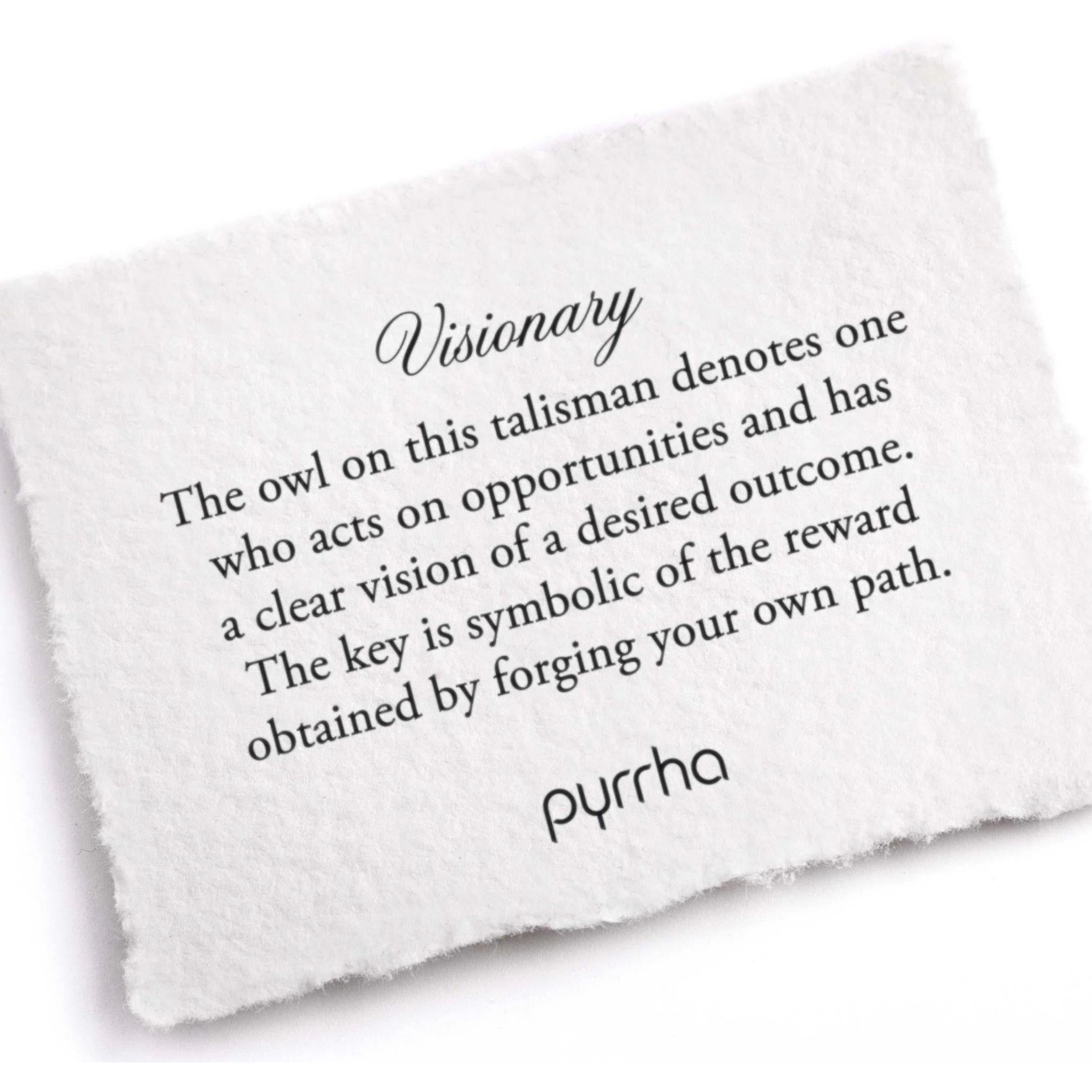 Le hibou sur ce talisman désigne celui qui agit sur les opportunités et a une vision claire du résultat souhaité. La clé symbolise la récompense obtenue en traçant votre propre chemin.