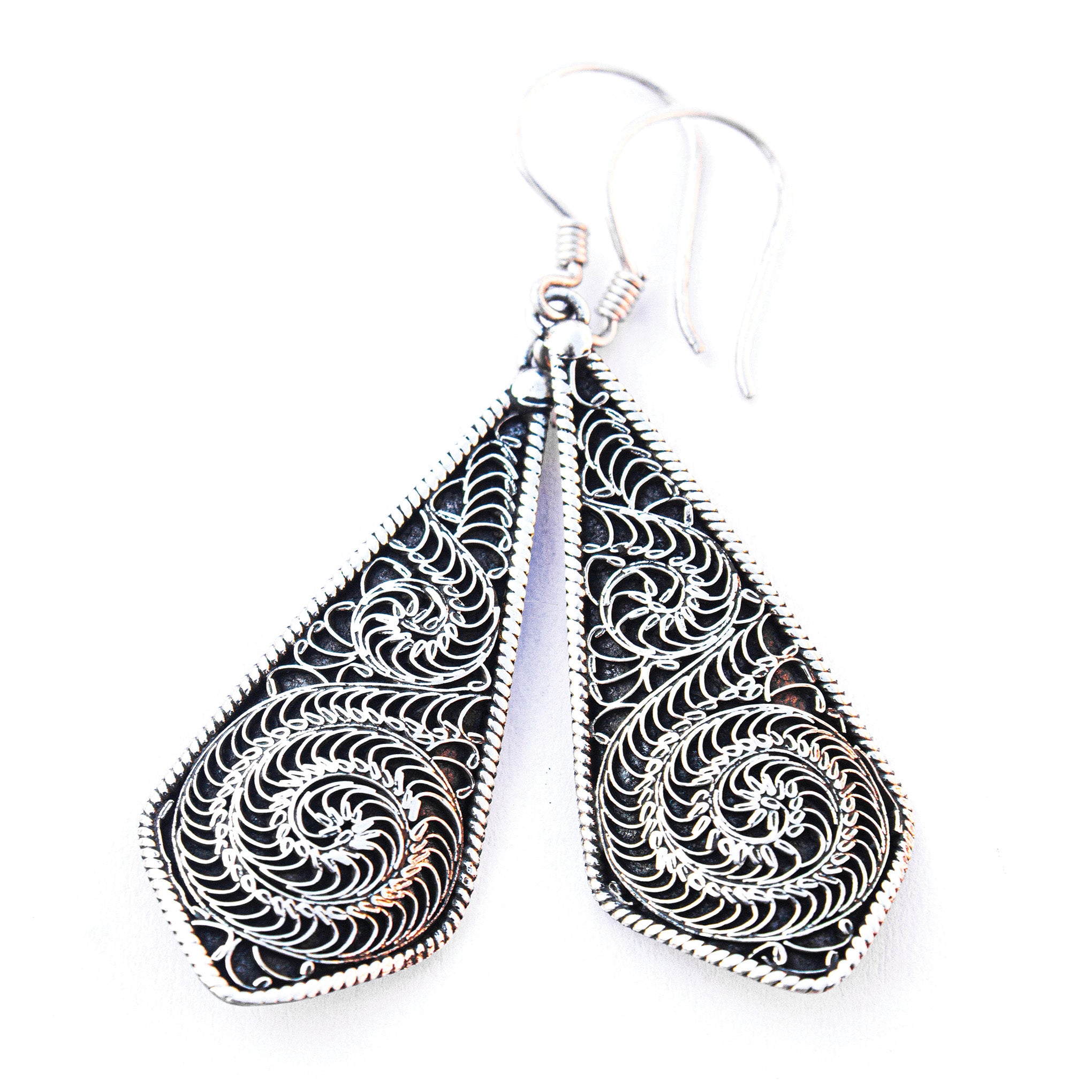 Argent sterling certifié et entièrement faites à la main. Ces boucles d'oreilles présentent un motif appelé "chasse". Ce motif est créé par une technique de martelage spéciale qui donne naissance à ces motifs en spirale très fins mais complexes.